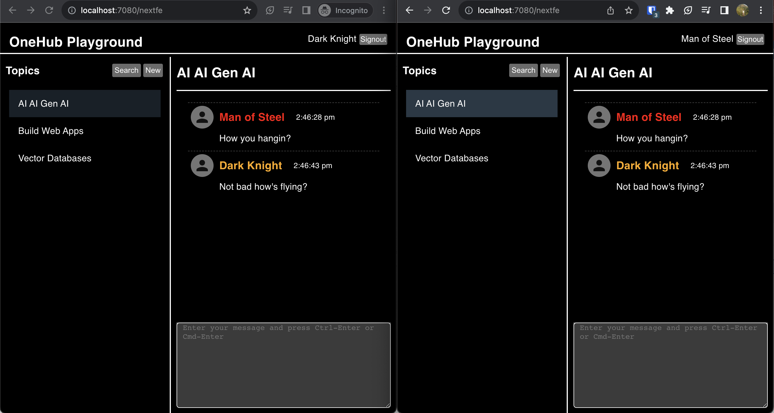 We are still using our fake users (where password == userid + “123”) so you can log in and send messages as different users for a complete (and yet completely insecure) chat experience!