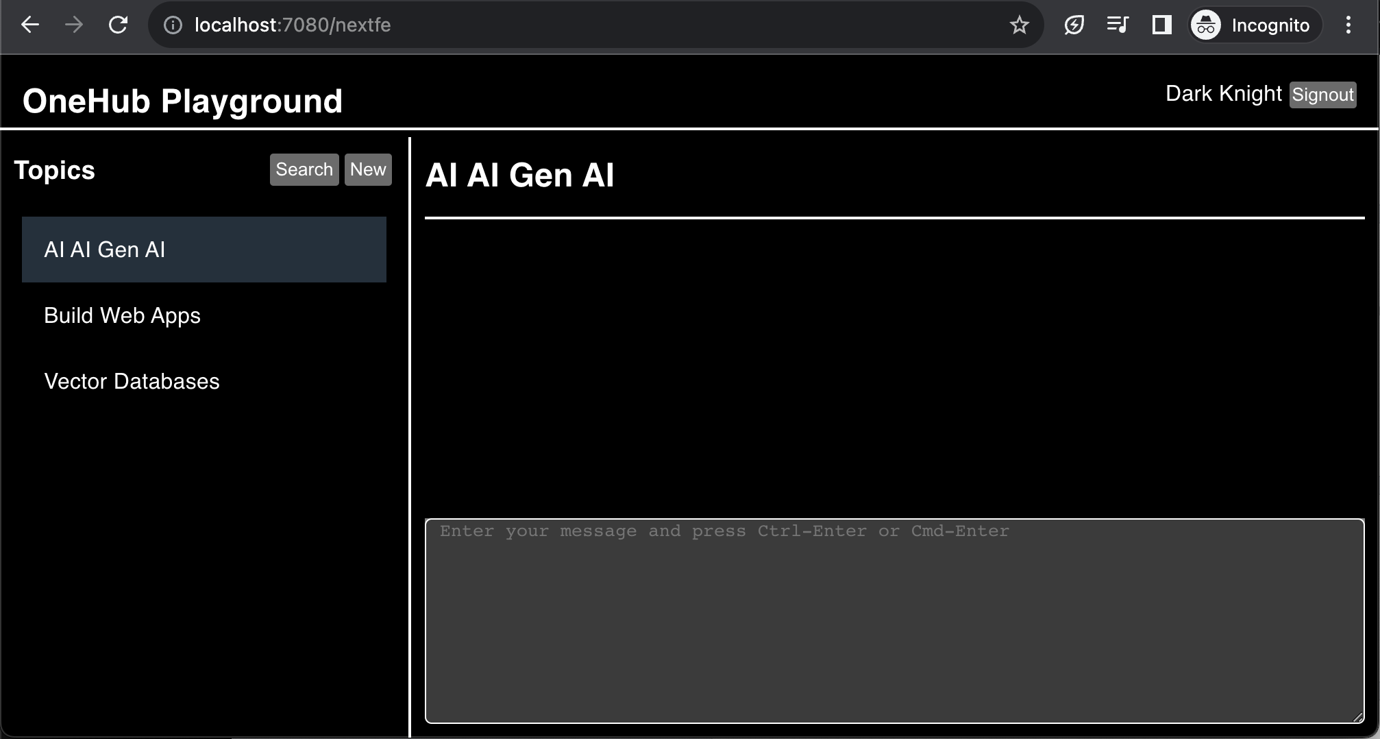 For a chat application a UI is a no-brainer. We will build a (super simple) Web UI using NextJS. The goal of this post is NOT to provide a cool UI or a deep tutorial on front end technologies - which is a technically very complex area. Instead the goal of this post is to: