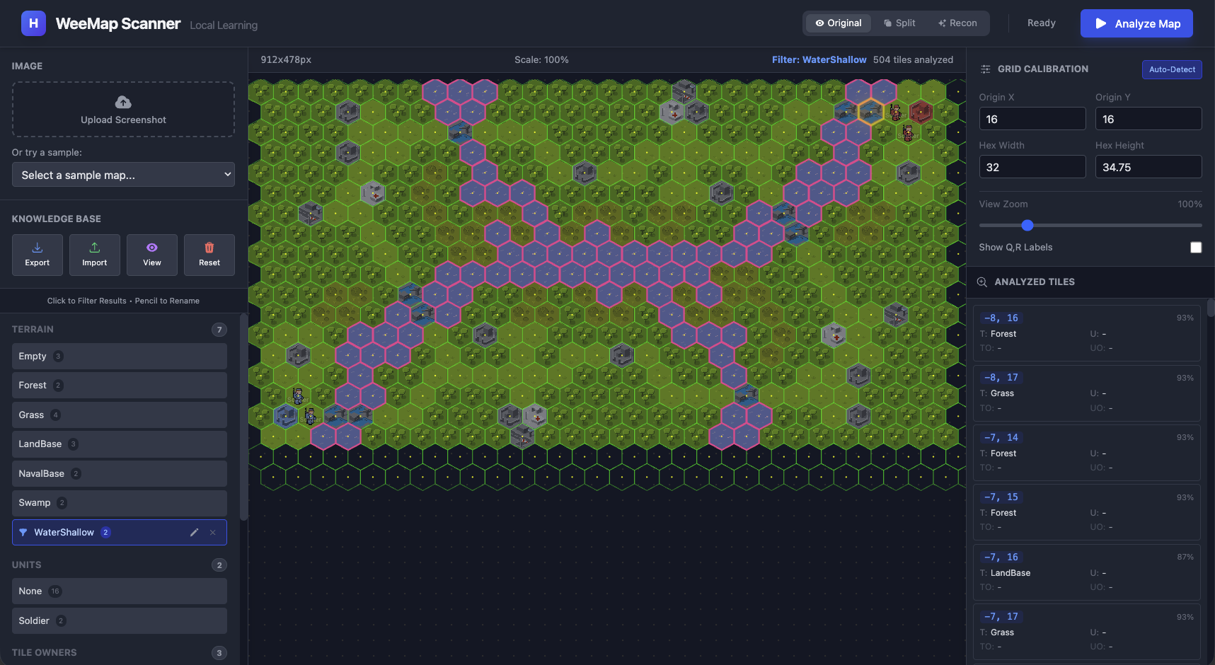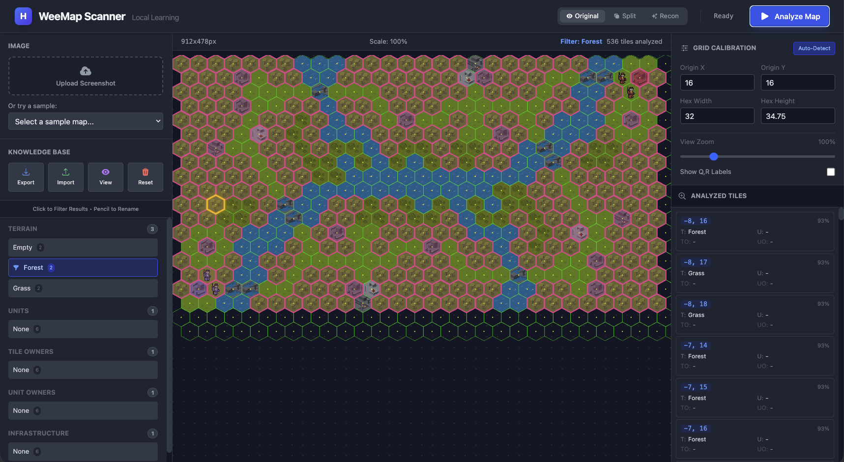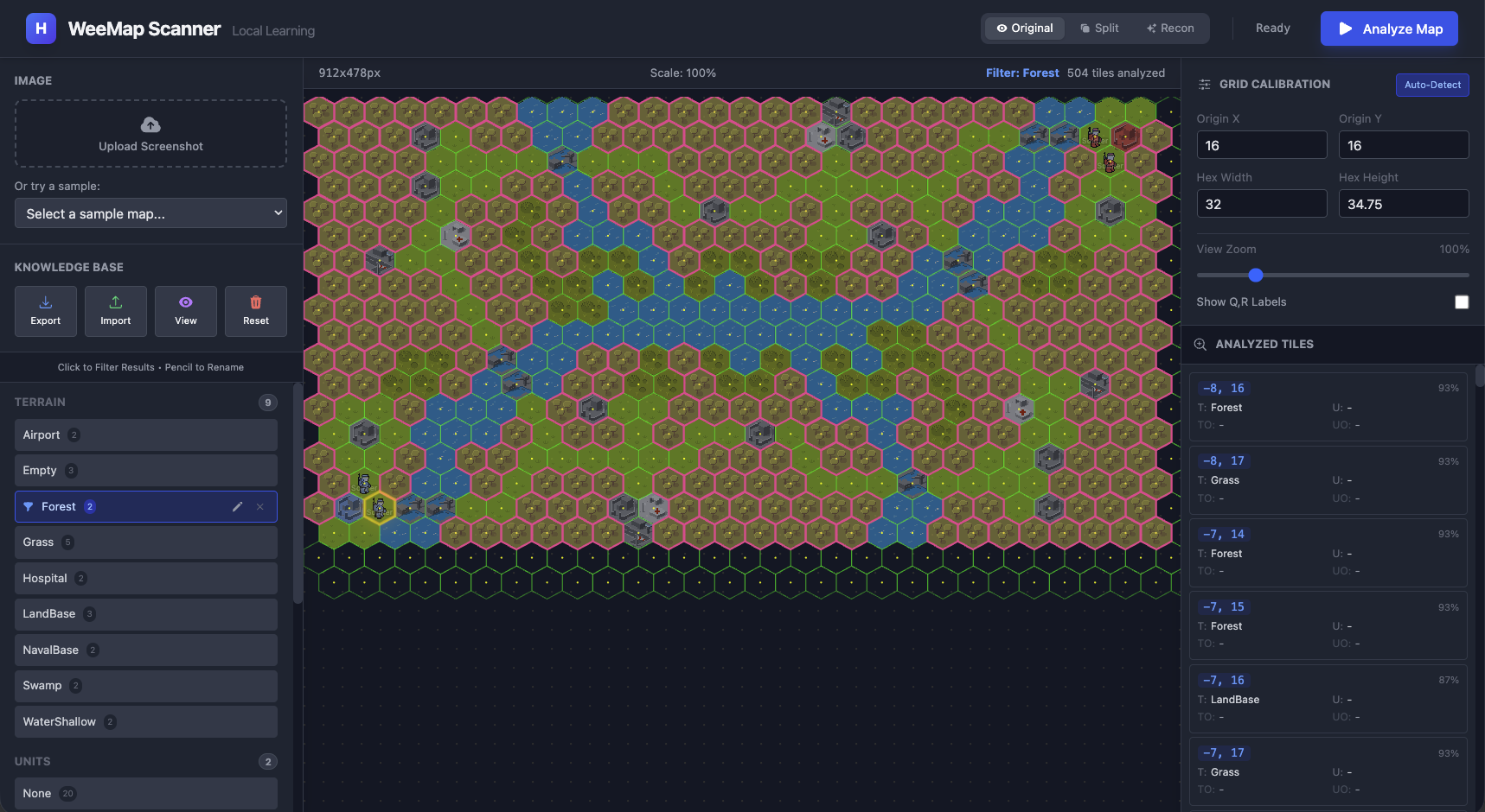 This project started as a continuation of my WeeWar map extraction experiments. In that post, I tried generating tile extraction scripts with Claude’s help. I had made a few assumptions (known screen/tile sizes, number of rows/columns of hex tiles etc). The perceptual hashing approach worked for pure terrain - a “Grass” tile hashes consistently, a “Mountain” tile hashes consistently. You can build a lookup table and match against it. But the moment a unit stood on a tile, everything got messy and fell apart. The hash of “Grass” and “Grass with Infantry” were completely different values. The algorithm saw them as unrelated images. If I wanted to recognize “this is Grass AND there’s a Tank on it,” something smarter than comparing p-hashes was needed.